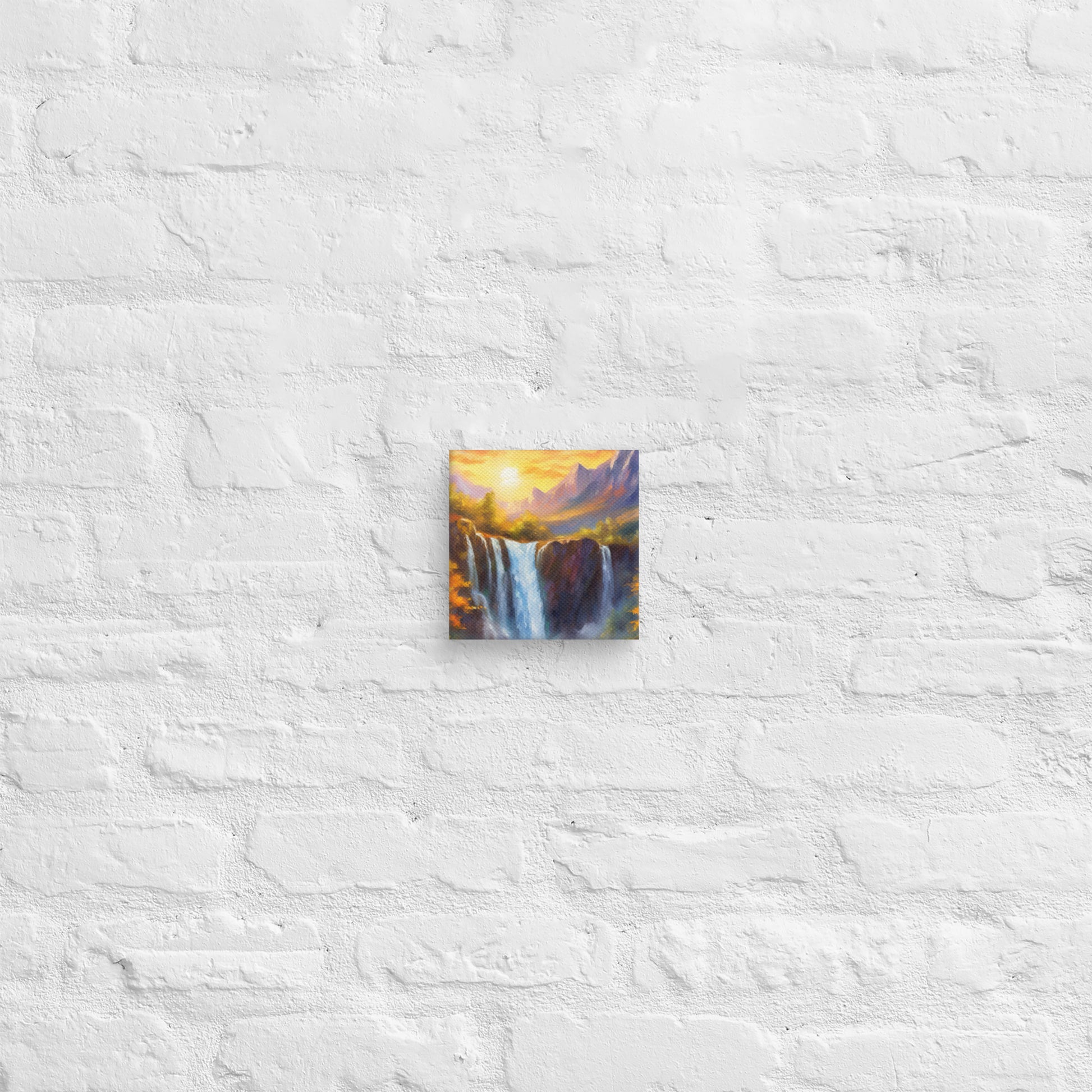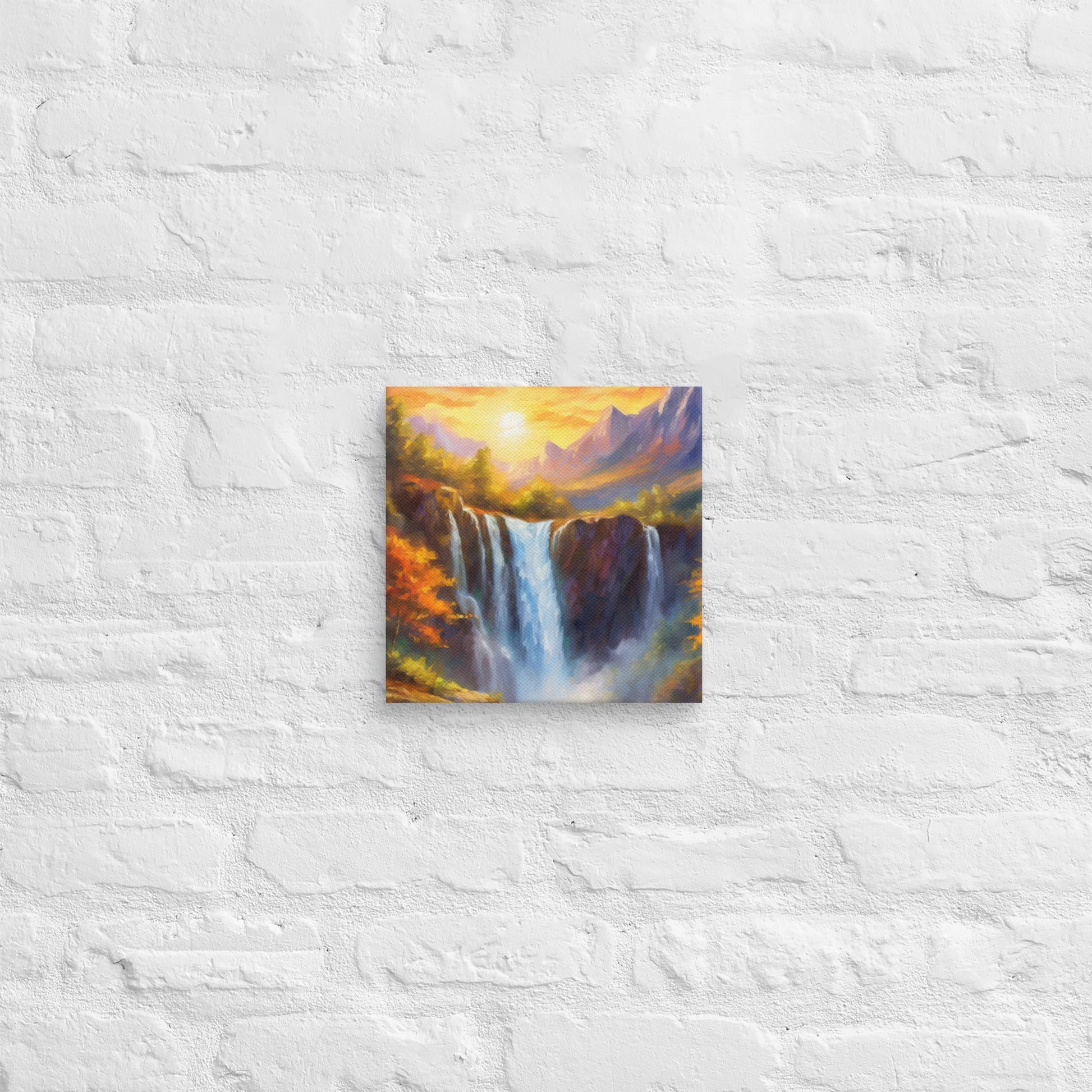 • Scenic and Majestic: The painting captures the awe-inspiring beauty of a mountain range, autumn sunset, and waterfall.