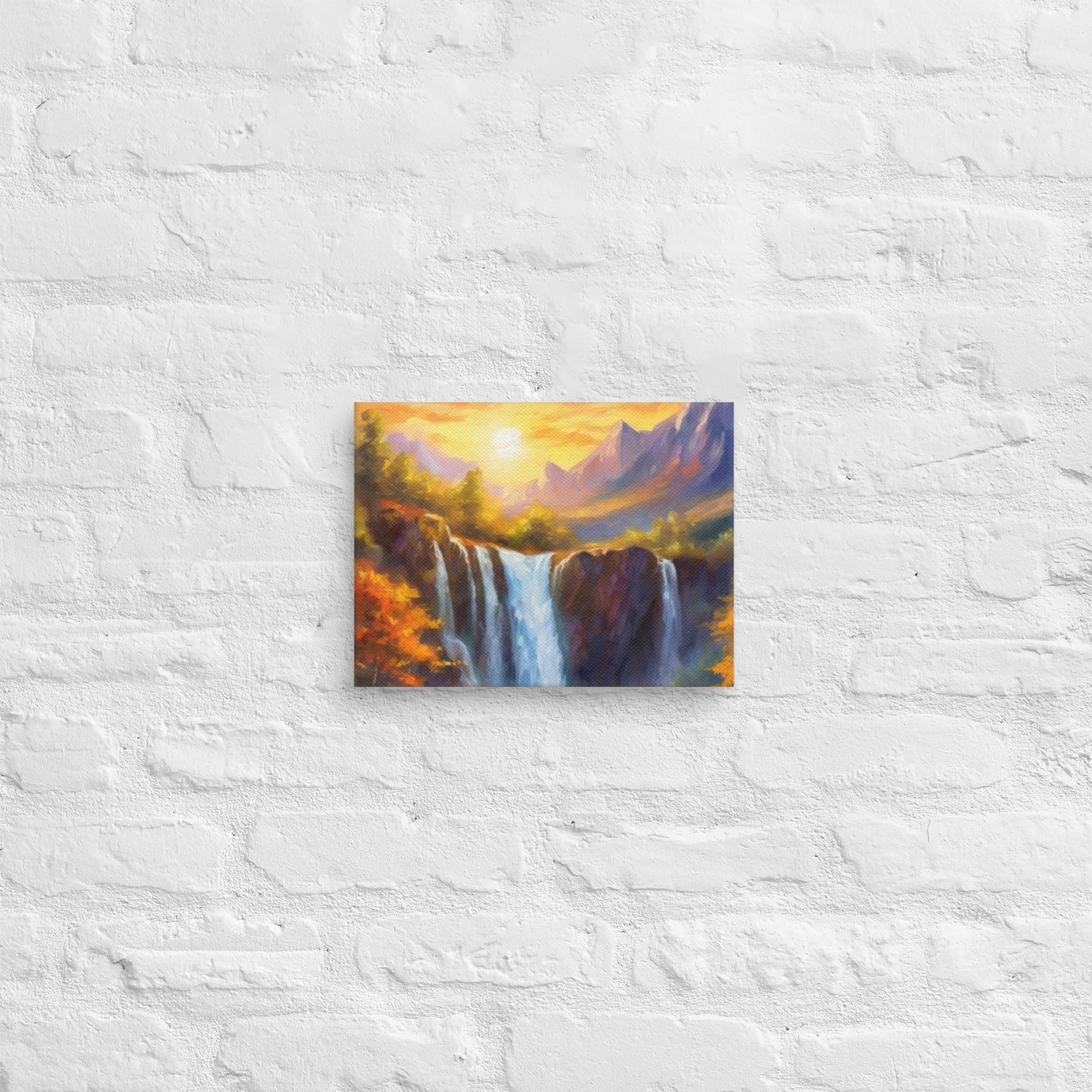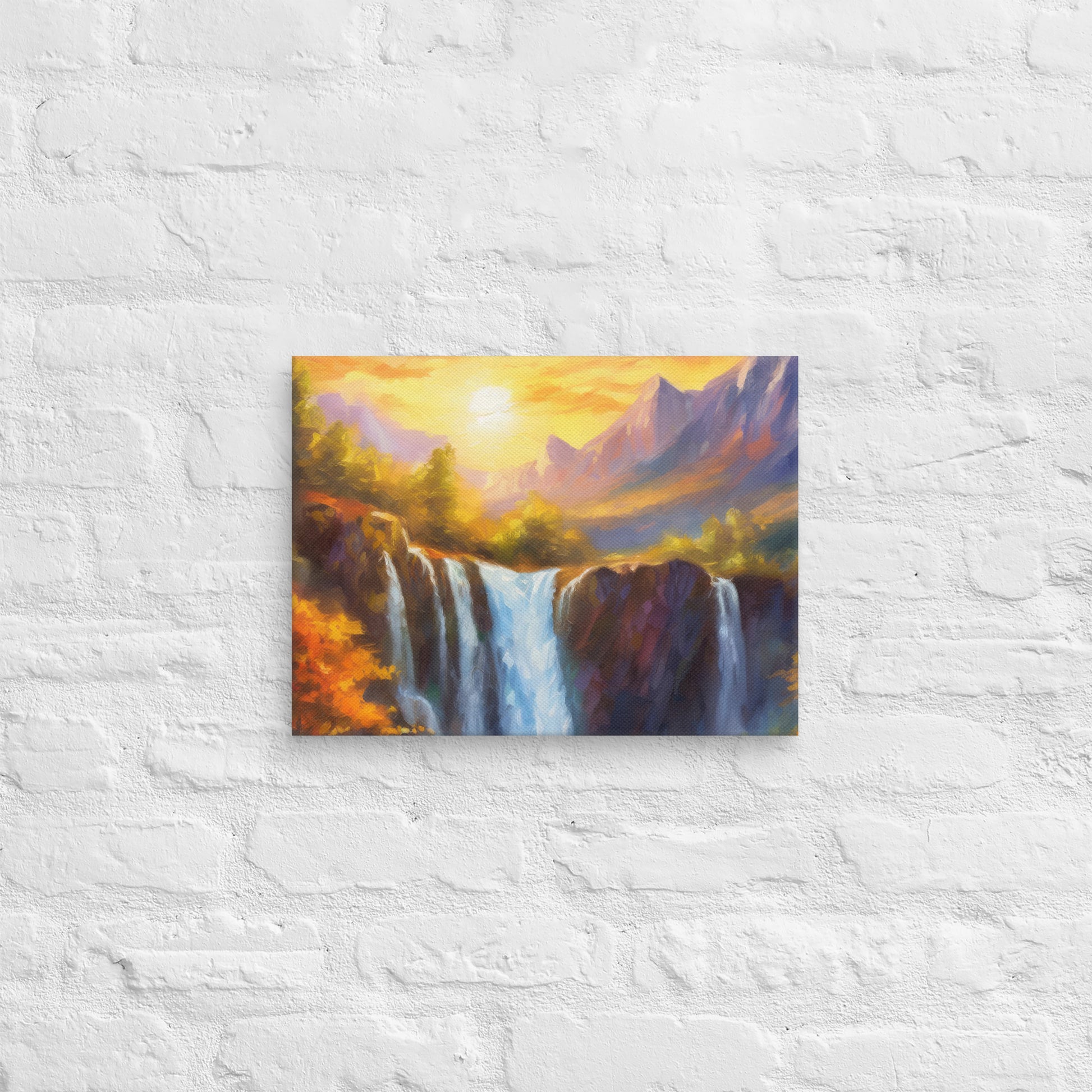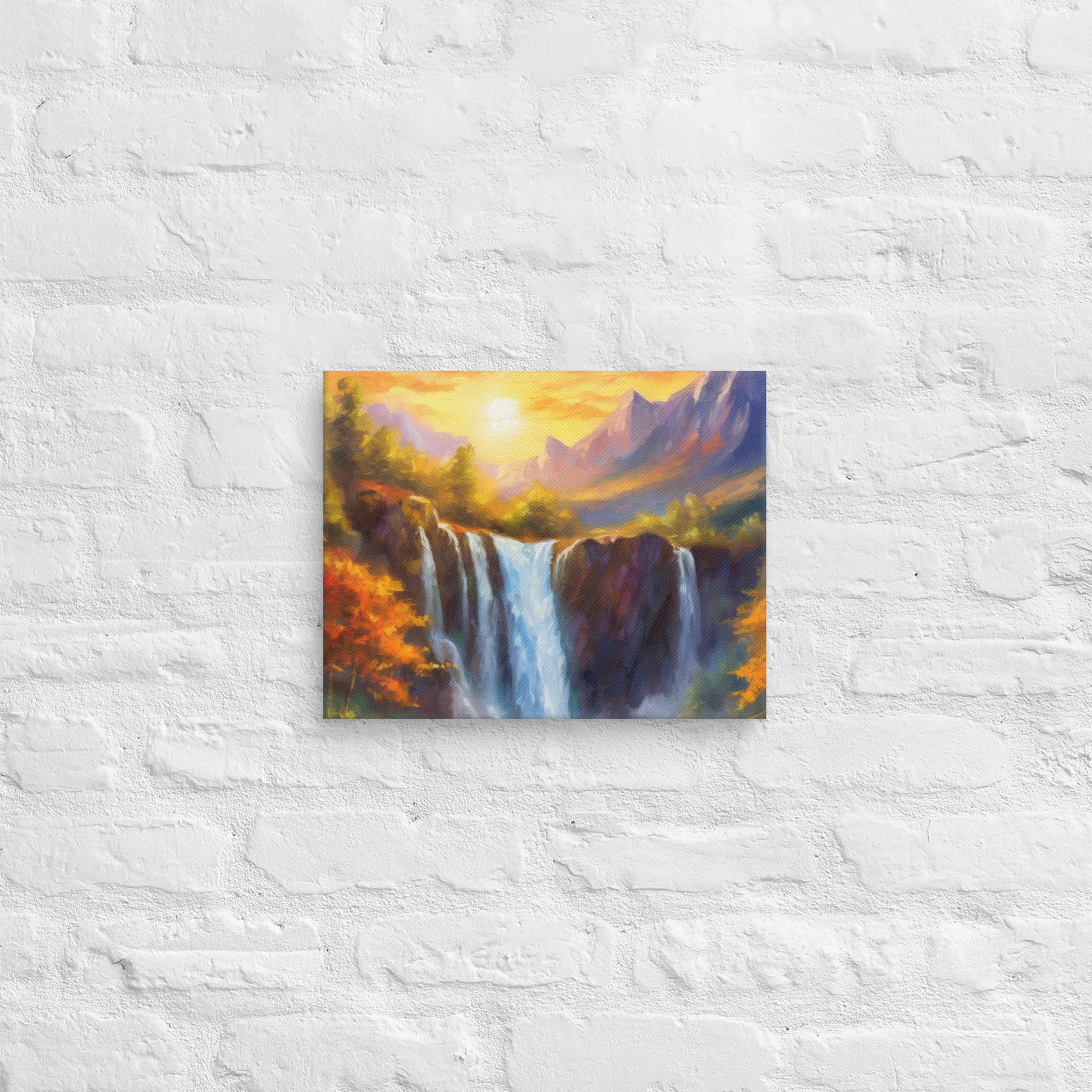 Add a breathtaking view to your space with this stunning fine art canvas featuring a vibrant and stylish oil painting of a majestic mountain range in an autumn sunset. Below the mountains sits a cliff, and through the middle of the cliff flows a majestic waterfall that crashes down to the creek below. This colorful and stylish piece is perfect for home and country décor, bringing the beauty of nature into your living space.
