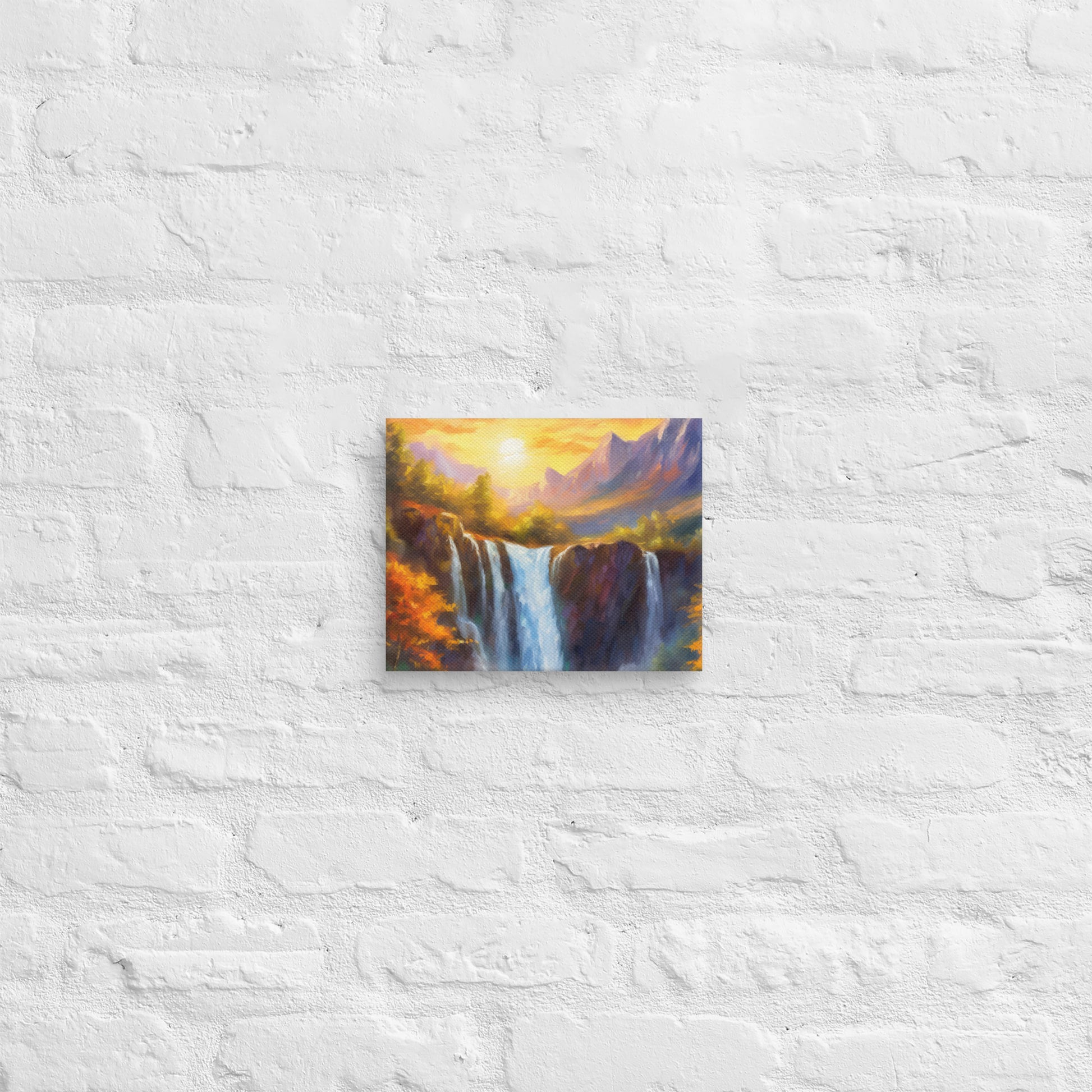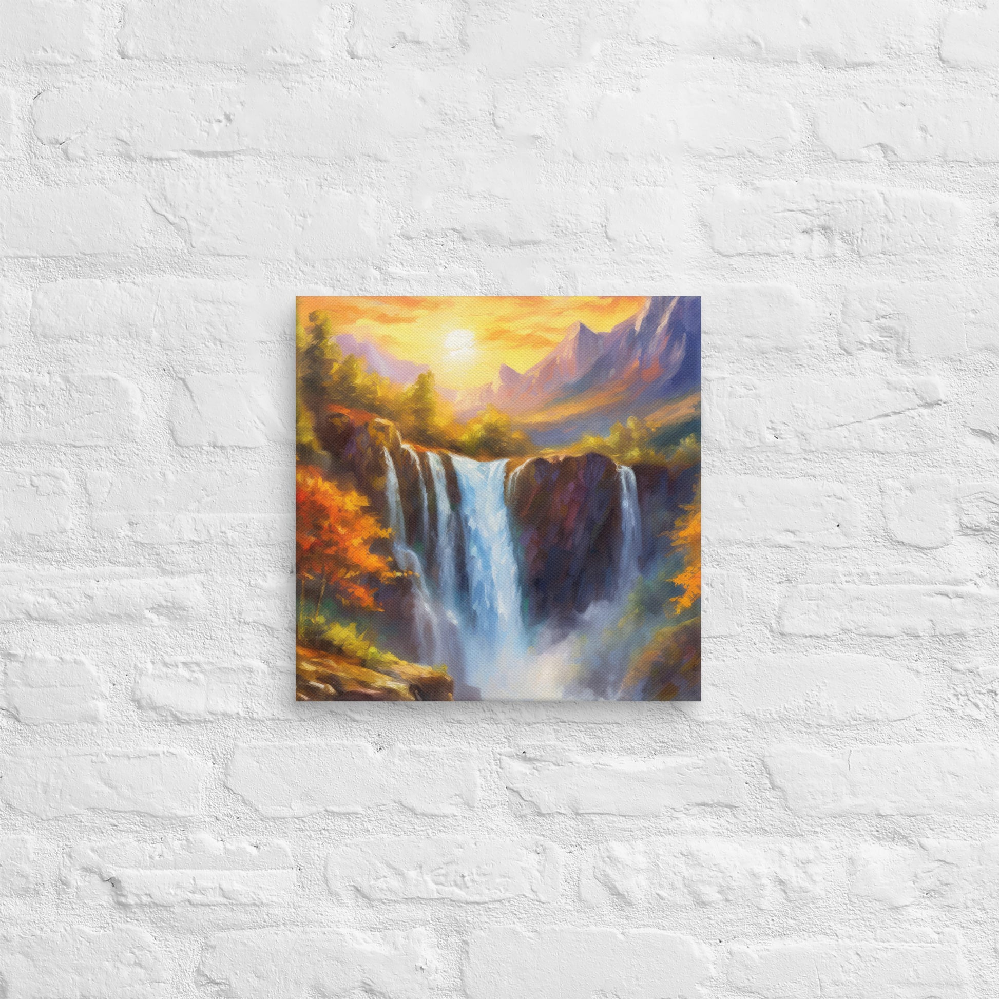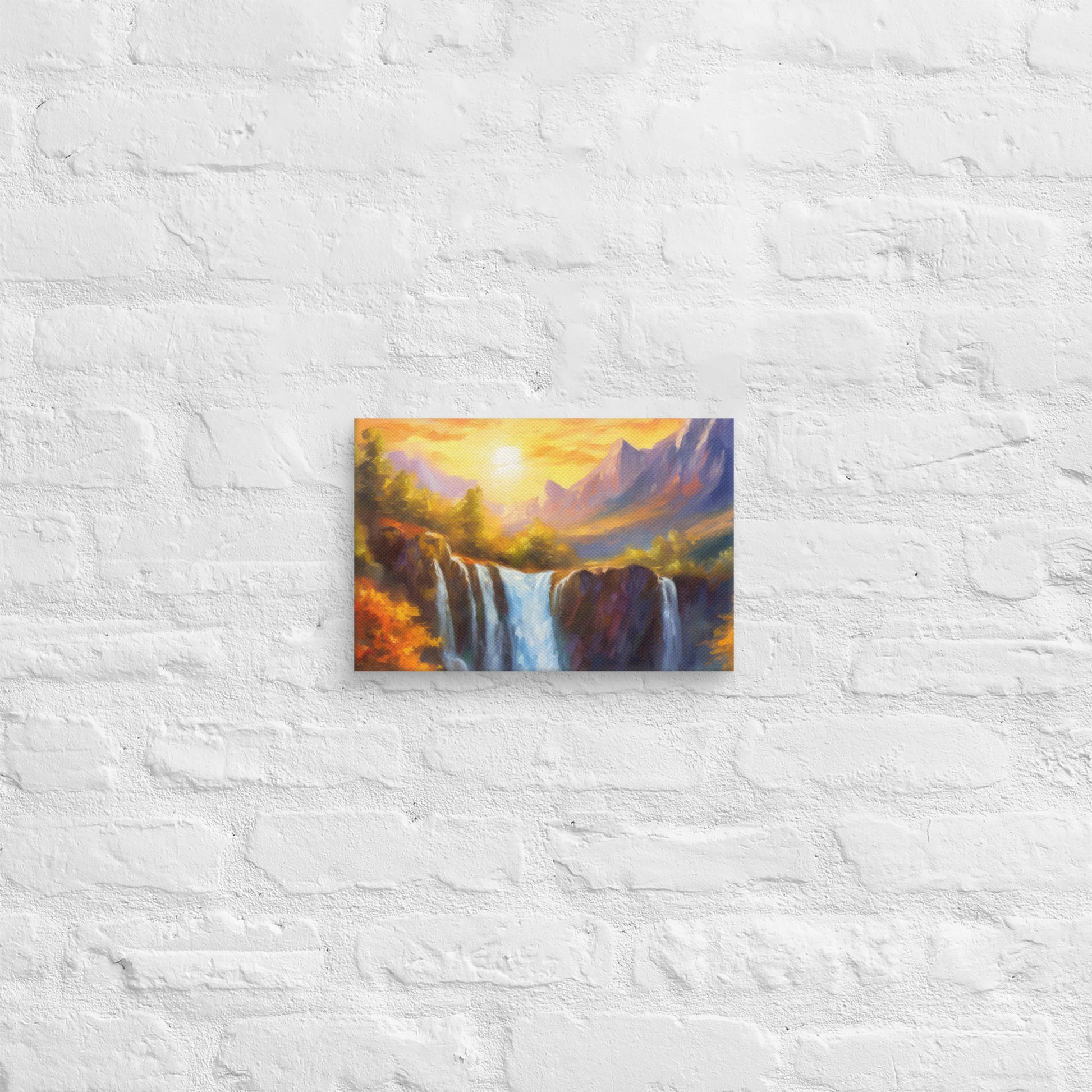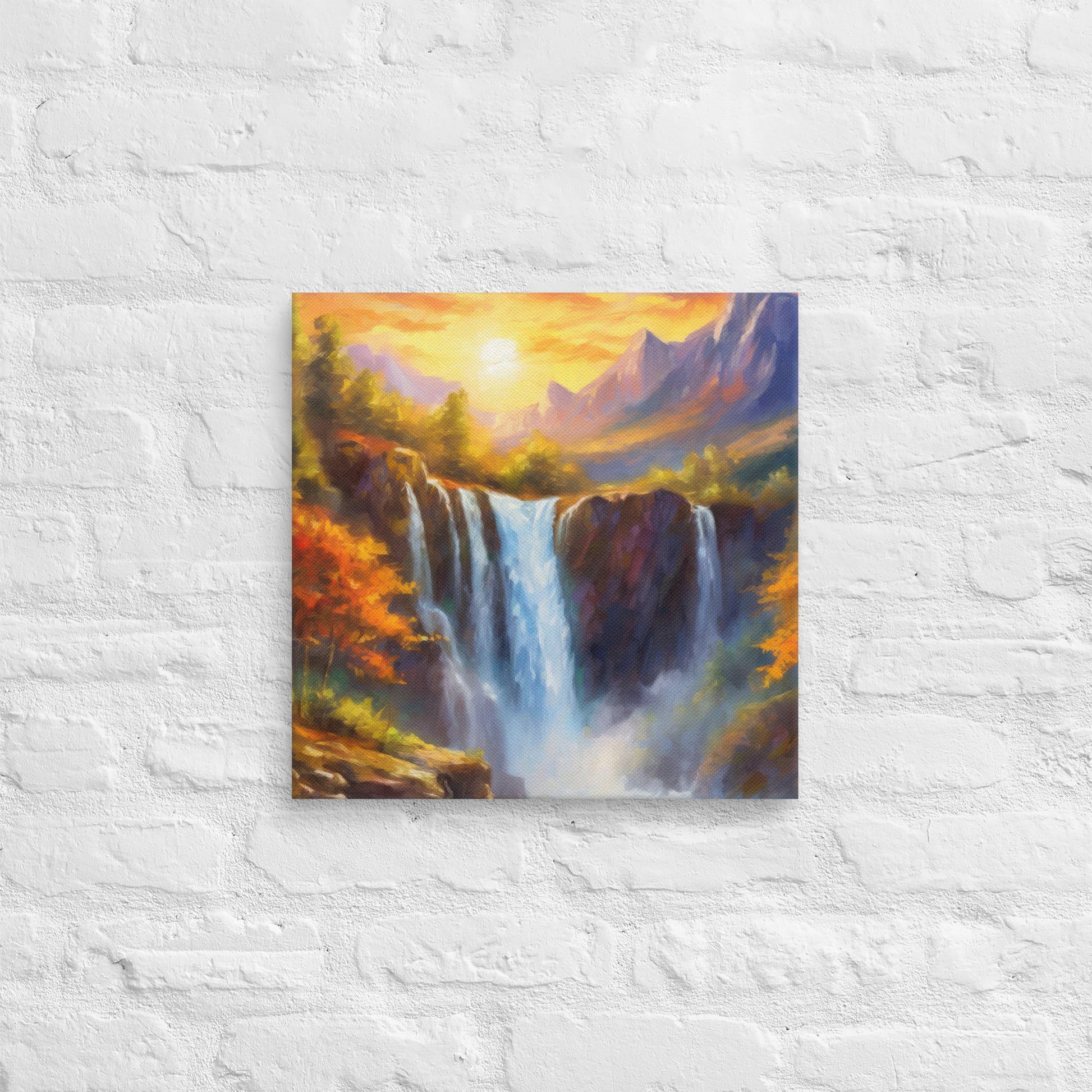 Add a breathtaking view to your space with this stunning fine art canvas featuring a vibrant and stylish oil painting of a majestic mountain range in an autumn sunset. Below the mountains sits a cliff, and through the middle of the cliff flows a majestic waterfall that crashes down to the creek below. This colorful and stylish piece is perfect for home and country décor, bringing the beauty of nature into your living space.