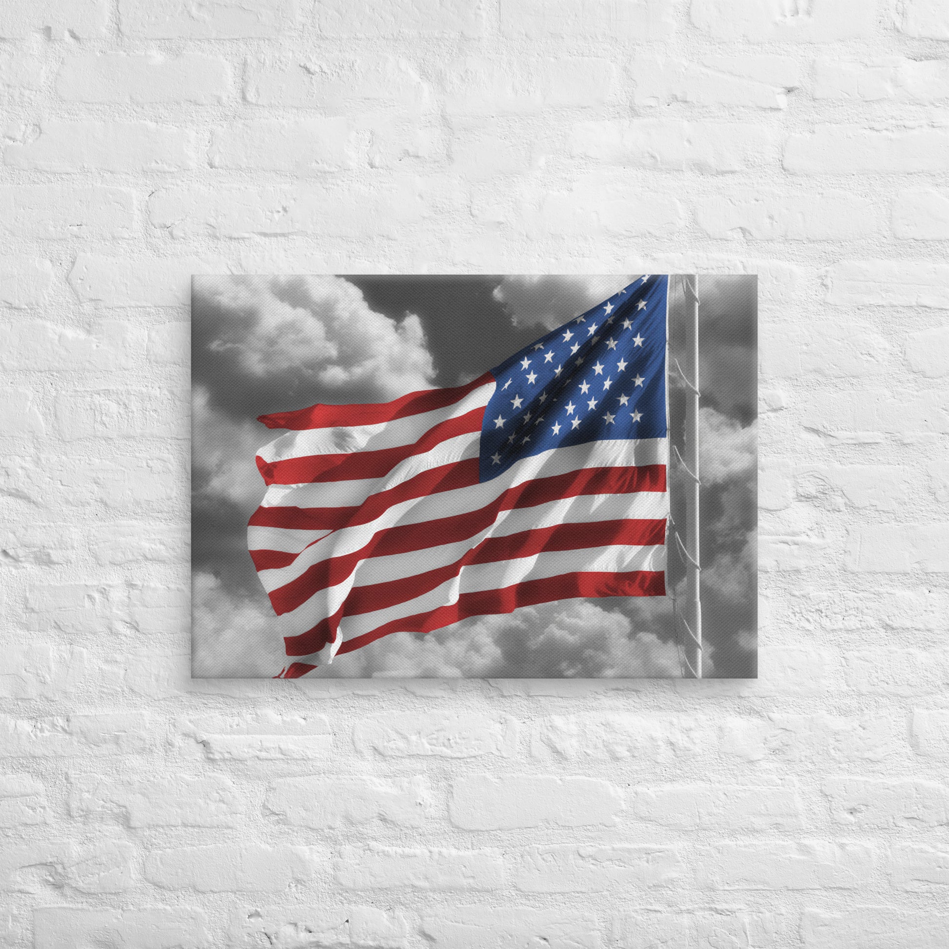 Add a touch of patriotism and style to your space with this stunning fine art canvas featuring a beautiful photograph of the American Flag, nicknamed Old Glory. The cloudy background sky has been converted to black and white, leaving the only color in the photo to be the red, white, and blue of the flag. This pleasing and stylish color splash effect makes it perfect wall decor for homes and offices, and a great gift for patriotic American holidays like the Fourth of July.