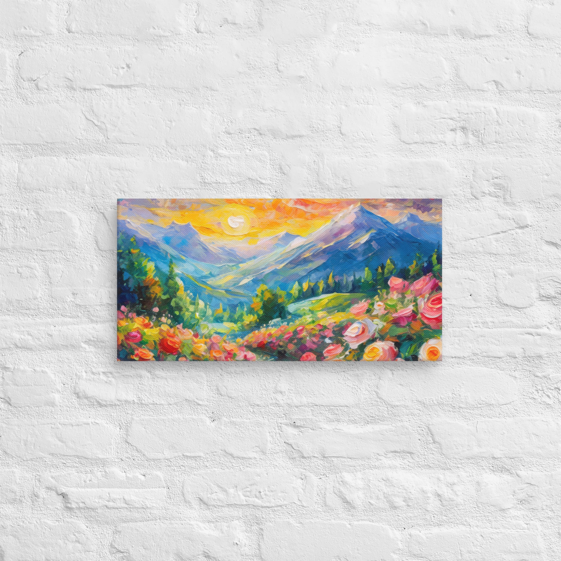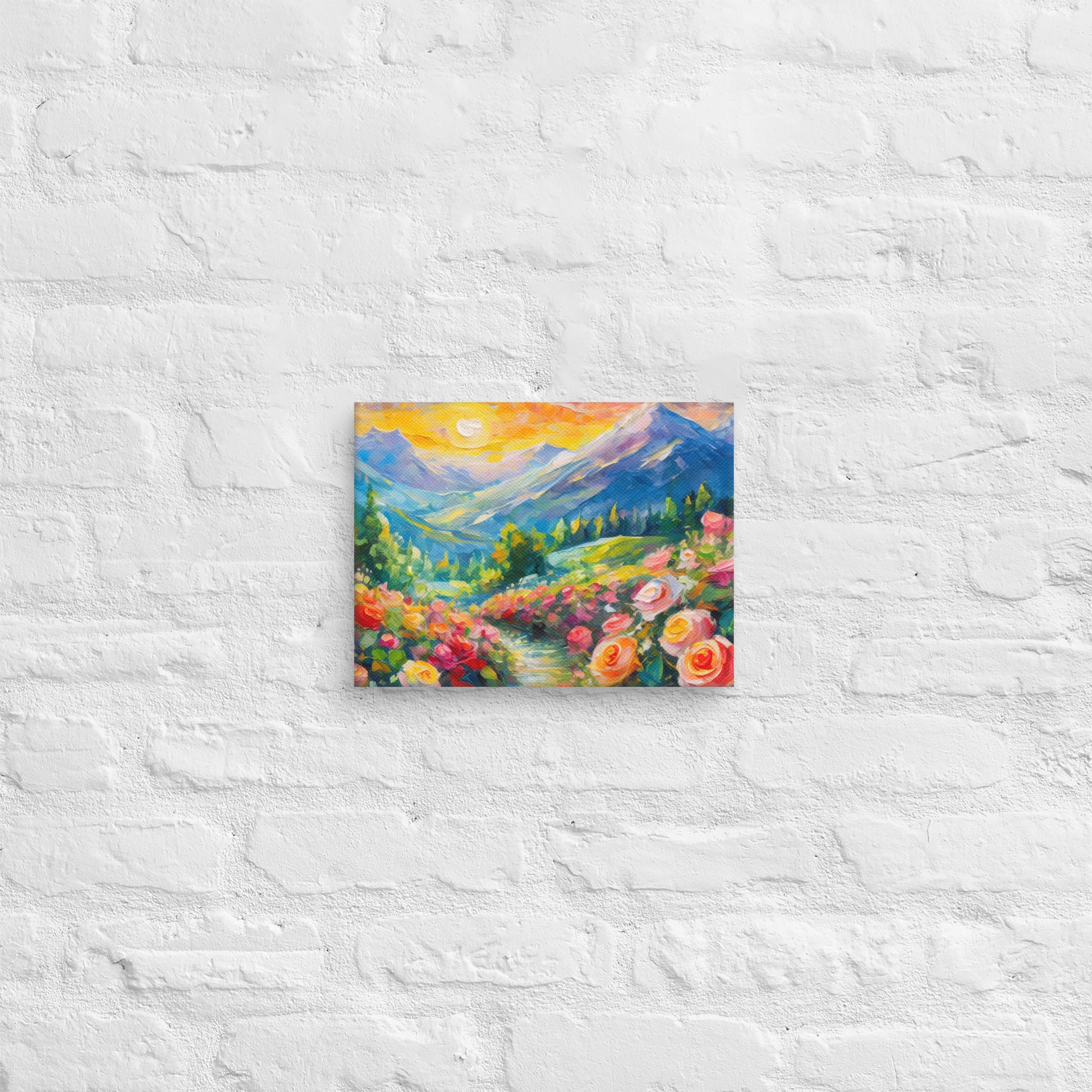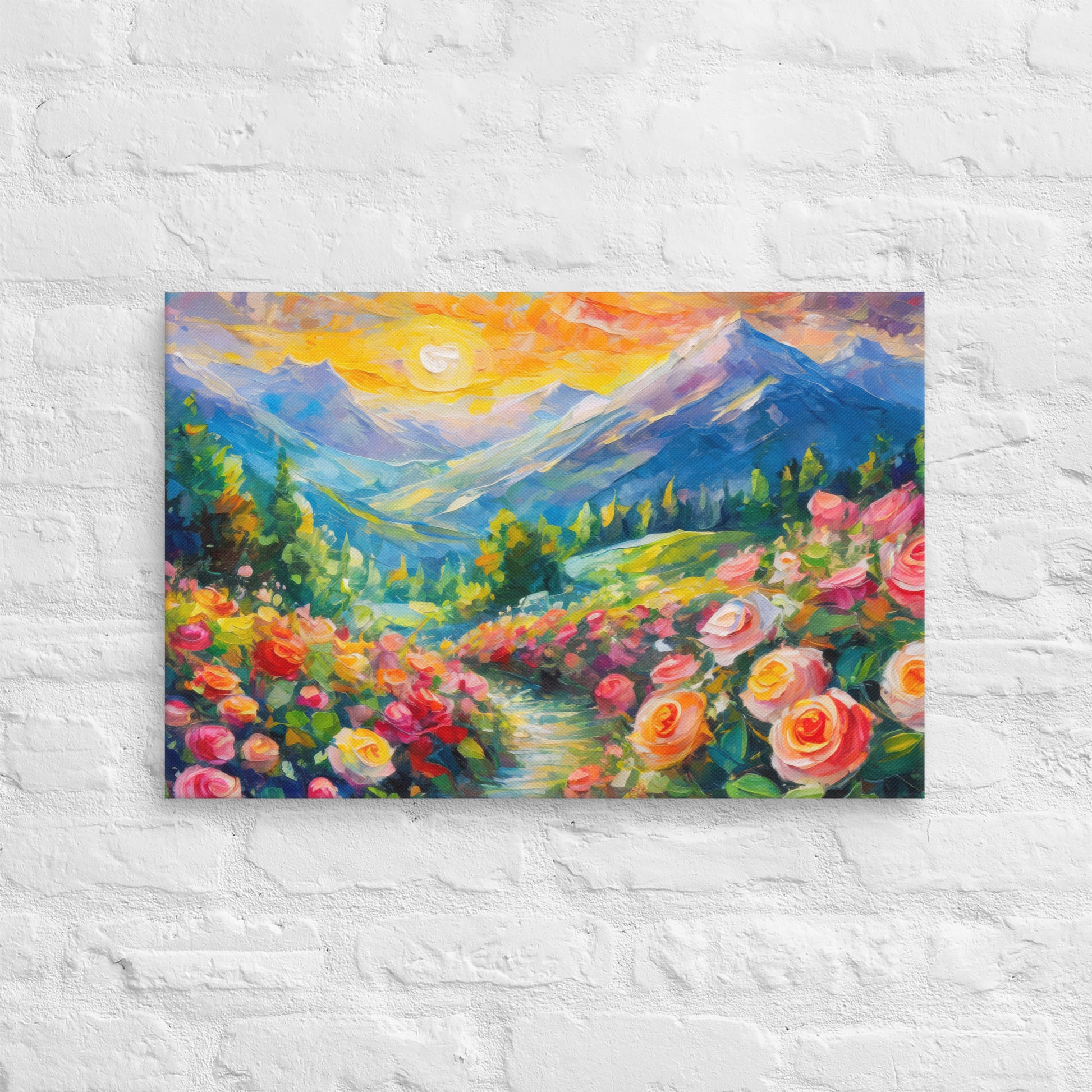Add a touch of natural beauty and elegance to your space with this stunning fine art canvas featuring a vibrant and stylish oil painting of a majestic mountain range at sunset. A grassy path surrounded by vibrant roses leads up to these mountains, creating a picturesque and serene scene. This colorful and stylish piece is perfect for home and country wall decor, bringing the tranquility of nature into your living space.