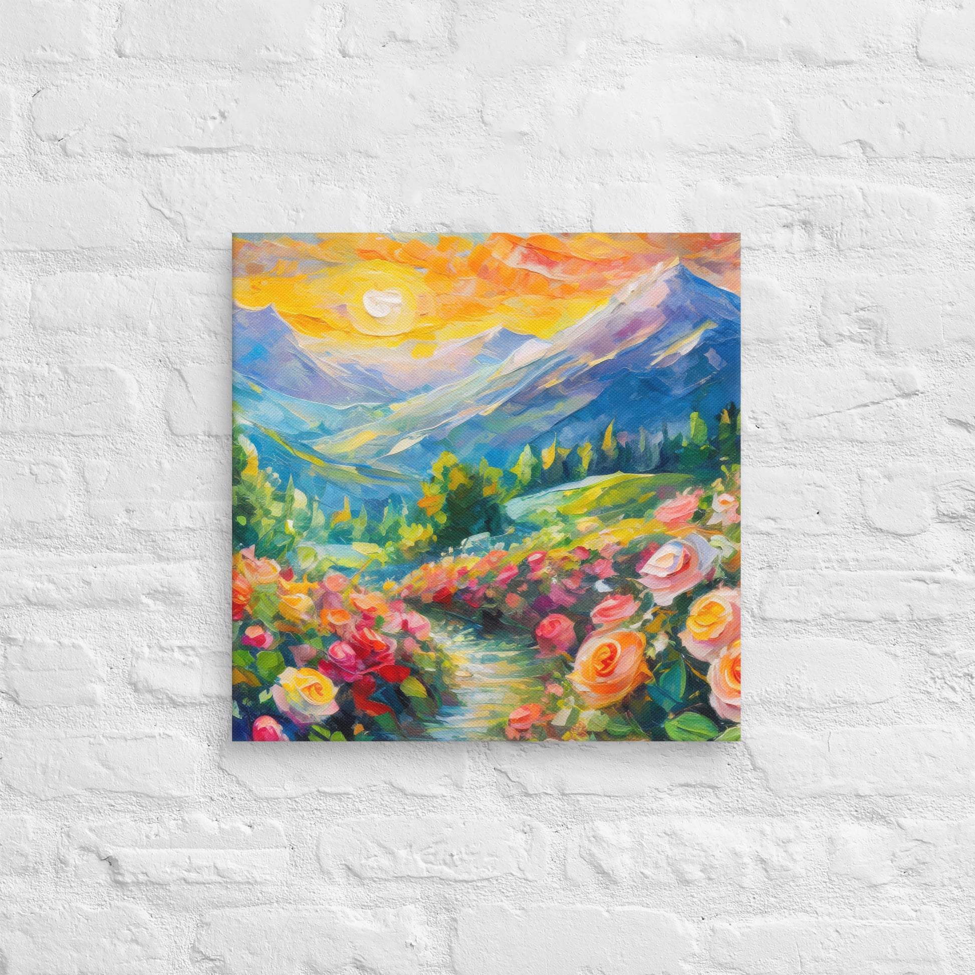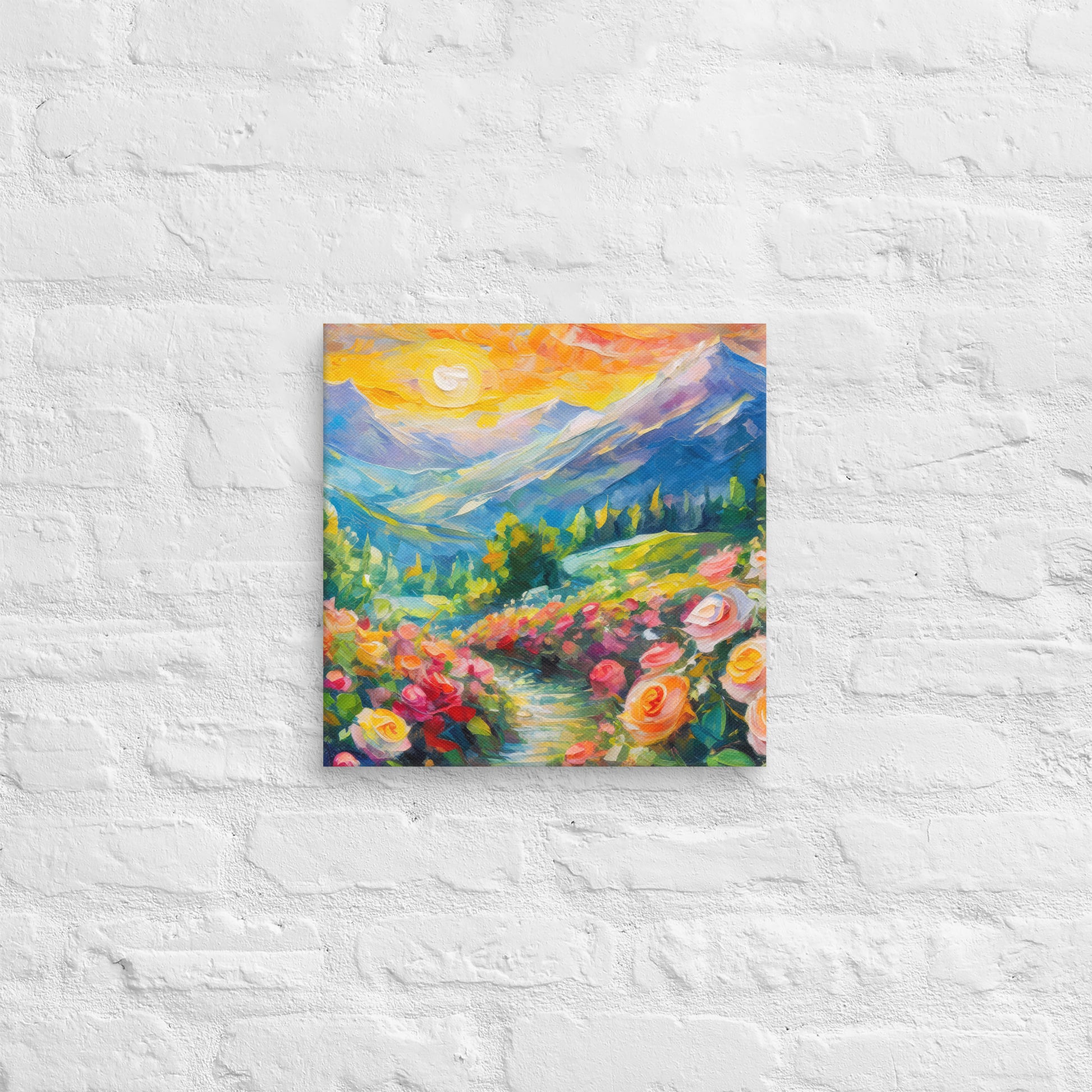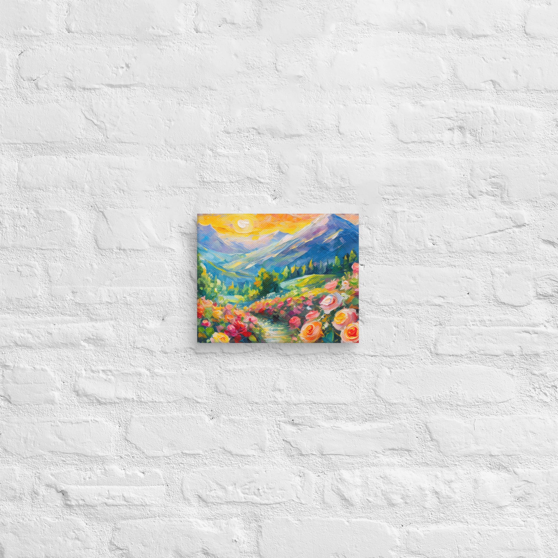 Add a touch of natural beauty and elegance to your space with this stunning fine art canvas featuring a vibrant and stylish oil painting of a majestic mountain range at sunset. A grassy path surrounded by vibrant roses leads up to these mountains, creating a picturesque and serene scene. This colorful and stylish piece is perfect for home and country wall decor, bringing the tranquility of nature into your living space.