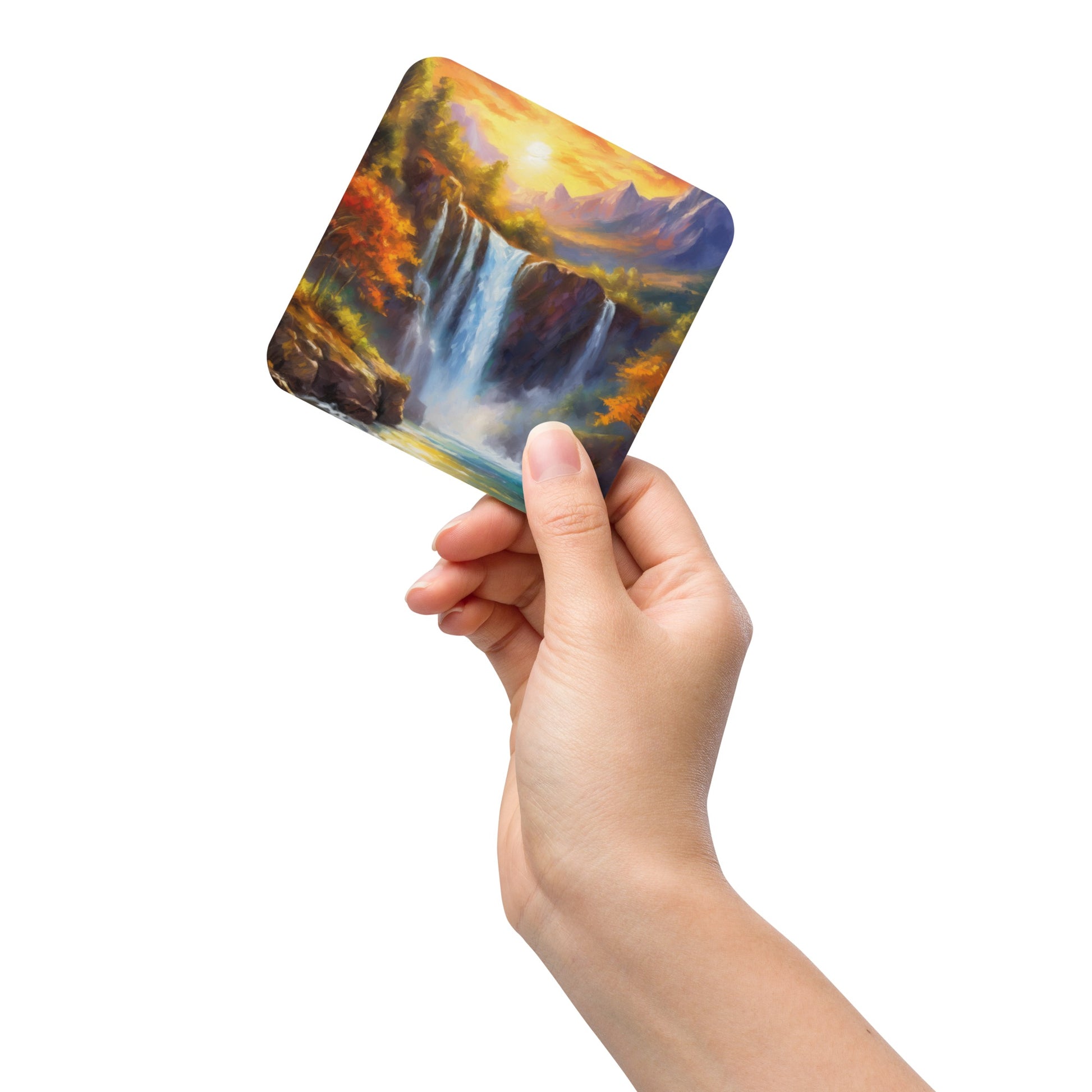 Elevate your home décor with our stunning cork-backed coaster featuring a vibrant oil painting of a majestic mountain range bathed in the warm hues of an autumn sunset. Below the mountains sits a cliff, with a breathtaking waterfall cascading down to the creek below. This colorful and stylish coaster is perfect for adding a touch of nature's beauty to any room.