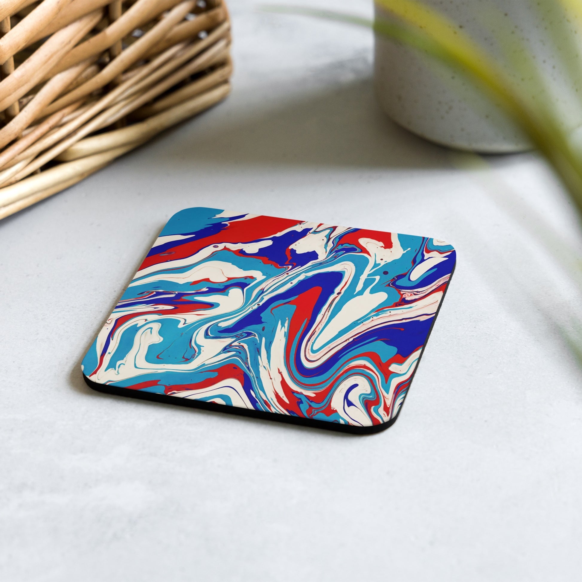 Vibrant Red, White & Blue Flow Painting Cork-Back Drink Coaster - Elegant Abstract And Modern Art Décor for Home, Kitchen, Cafe And Office