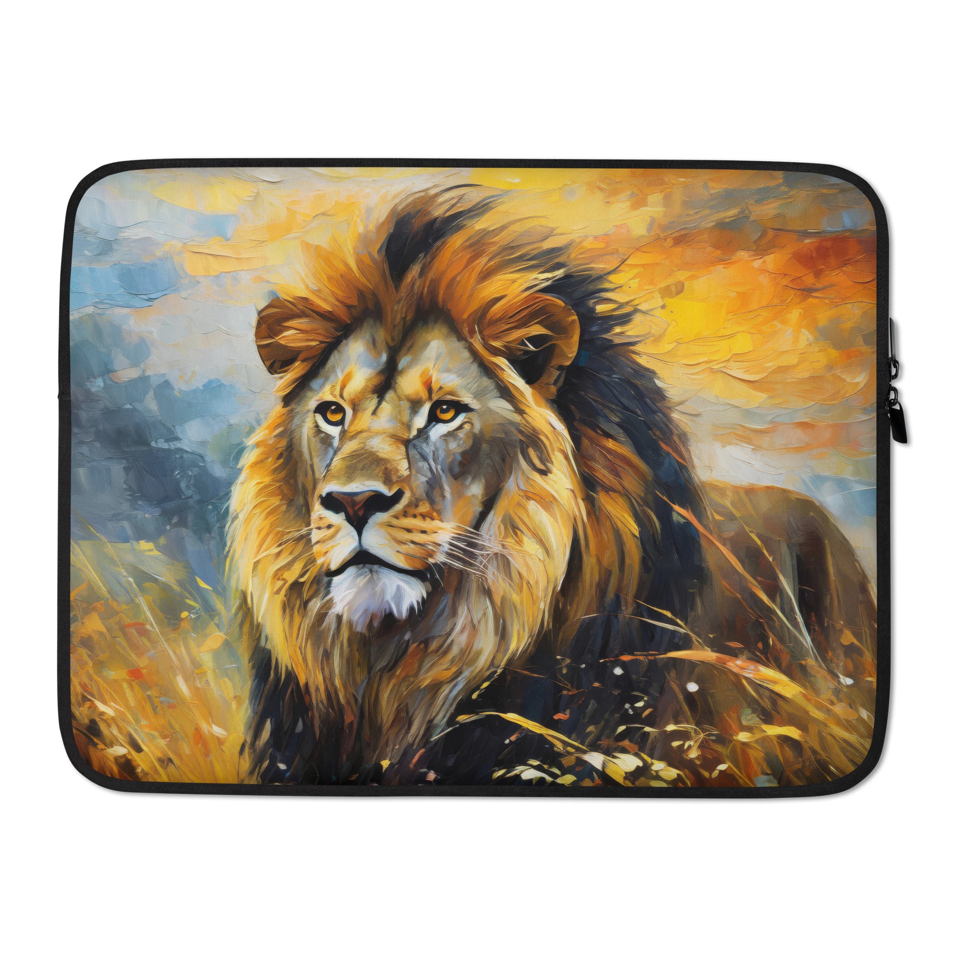 Protect your laptop in style with our vibrant and colorful laptop sleeve featuring a stunning oil painting of a majestic African lion. This male lion, with its beautiful mane, is depicted walking through the golden fields of Africa under a breathtaking evening sky. The rich colors and intricate details of the artwork make this sleeve a standout accessory for any laptop user.