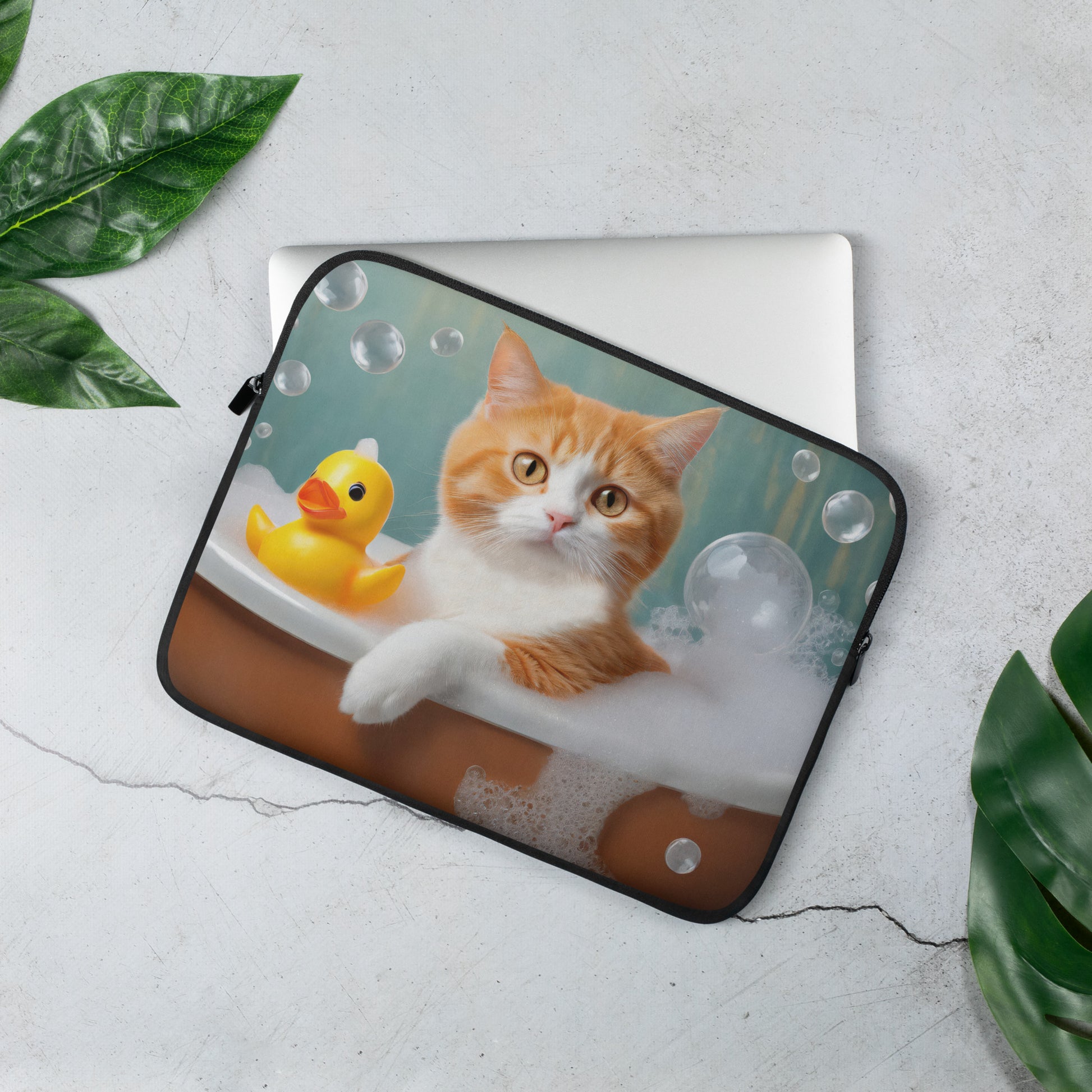 This colorful laptop sleeve features a delightful scene of a cat with orange fur enjoying a bubble bath in a small orange bowl. Beside the cat, a cheerful yellow rubber duck floats among the bubbles, while more bubbles drift through the air, creating a playful and heartwarming image.