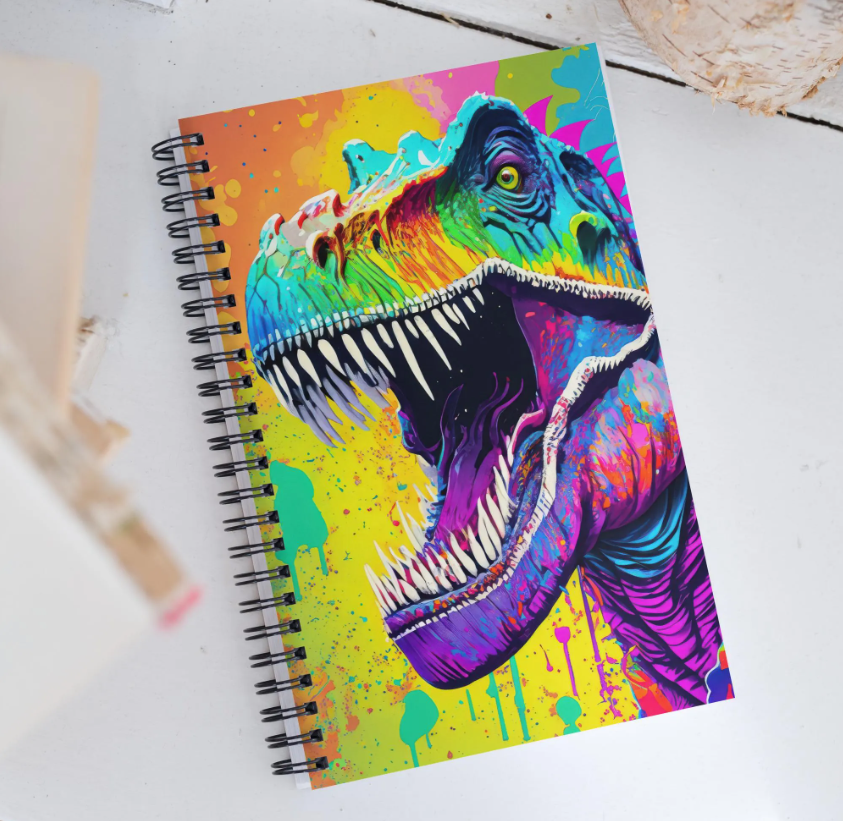 Unleash your creativity with this vibrant, stylish, psychedelic, grunge, pop art spiral notebook featuring a colorful T-Rex painting. Bursting with all the colors of the rainbow, this notebook is the perfect gift for lovers of alternative, pop, psychedelic, and graffiti art. It's ideal for adding a pop of color and personality to your stationery collection, making it perfect for dorms, kids' rooms, and teen bedrooms.