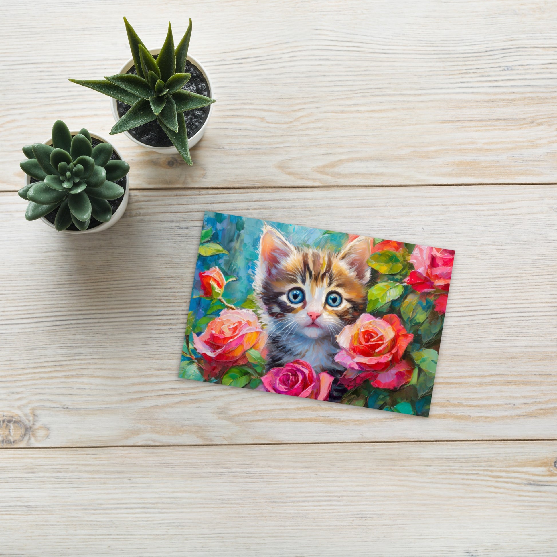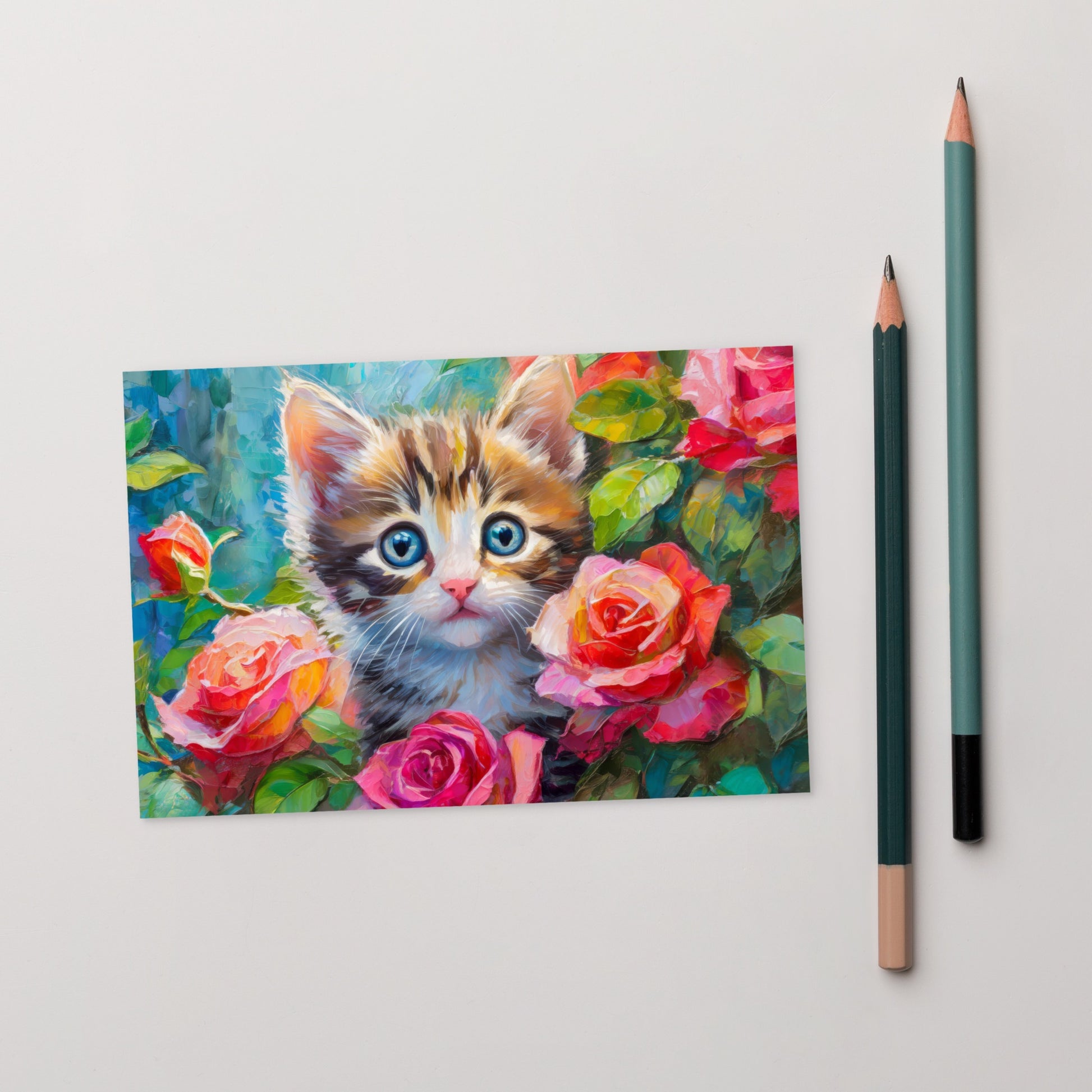 Adorable Kitten In Rose Bush Postcard - Vibrant Oil Painting - Stylish Gift For Cat, Nature, And Flower Lovers, Beautiful Stationary Decor