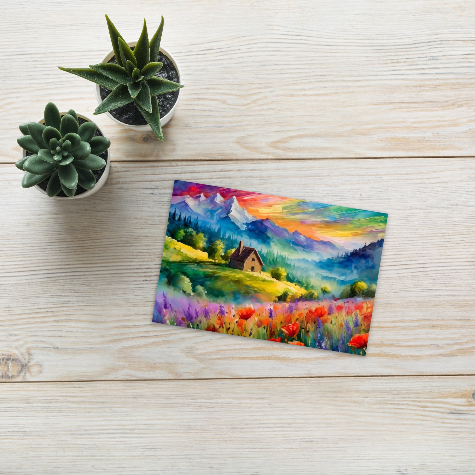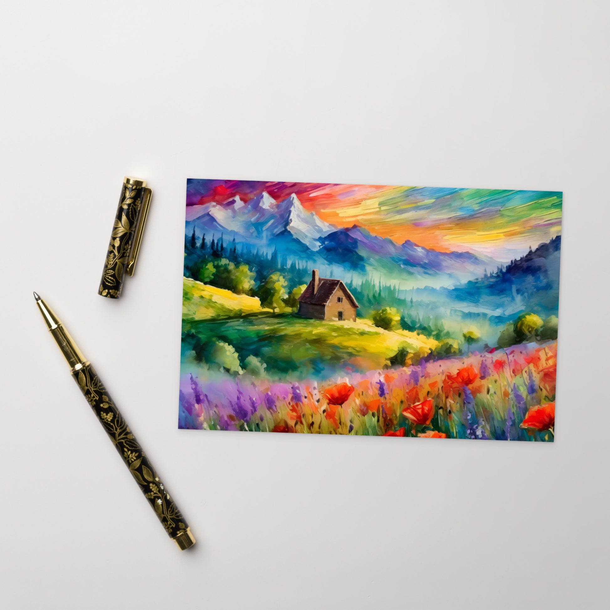 This stunning postcard features an oil painting of a majestic mountain range bathed in the vibrant hues of a colorful sunset. Nestled in the valley is a charming cabin, surrounded by fields of blooming flowers. The vivid colors and expressive brushstrokes are reminiscent of Van Gogh's iconic style, making this postcard a true work of art.