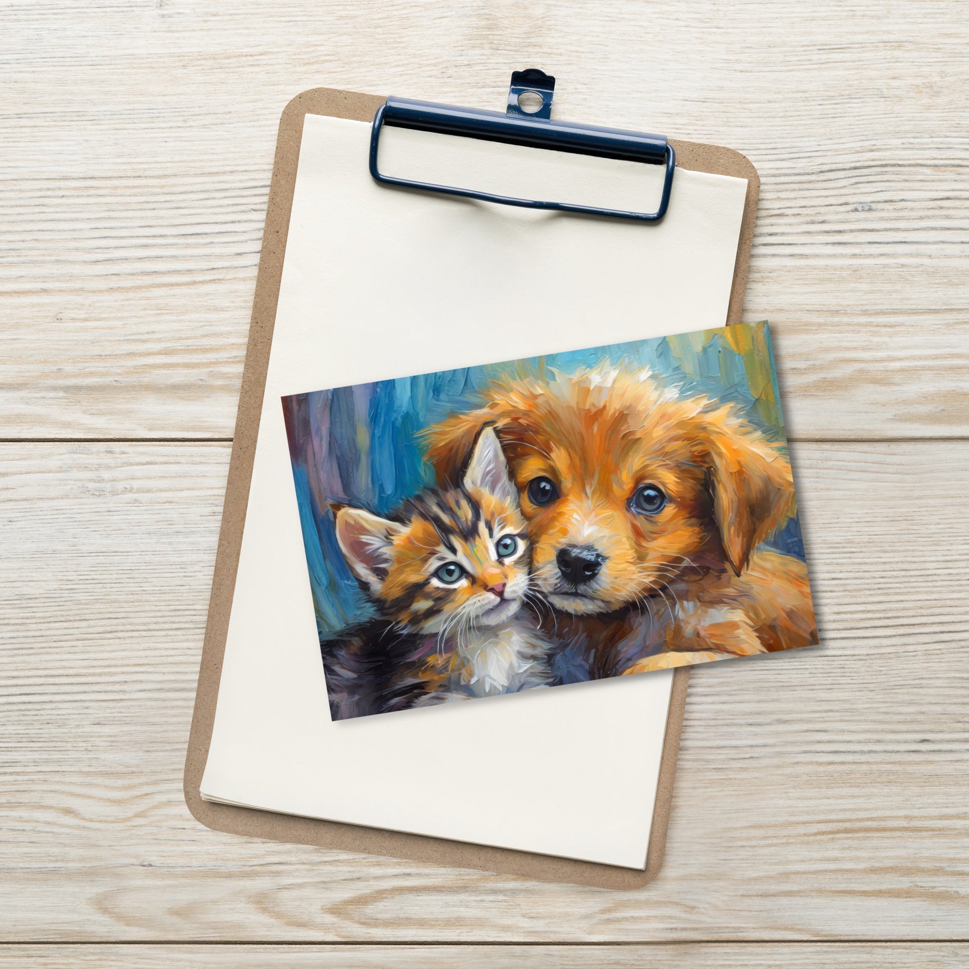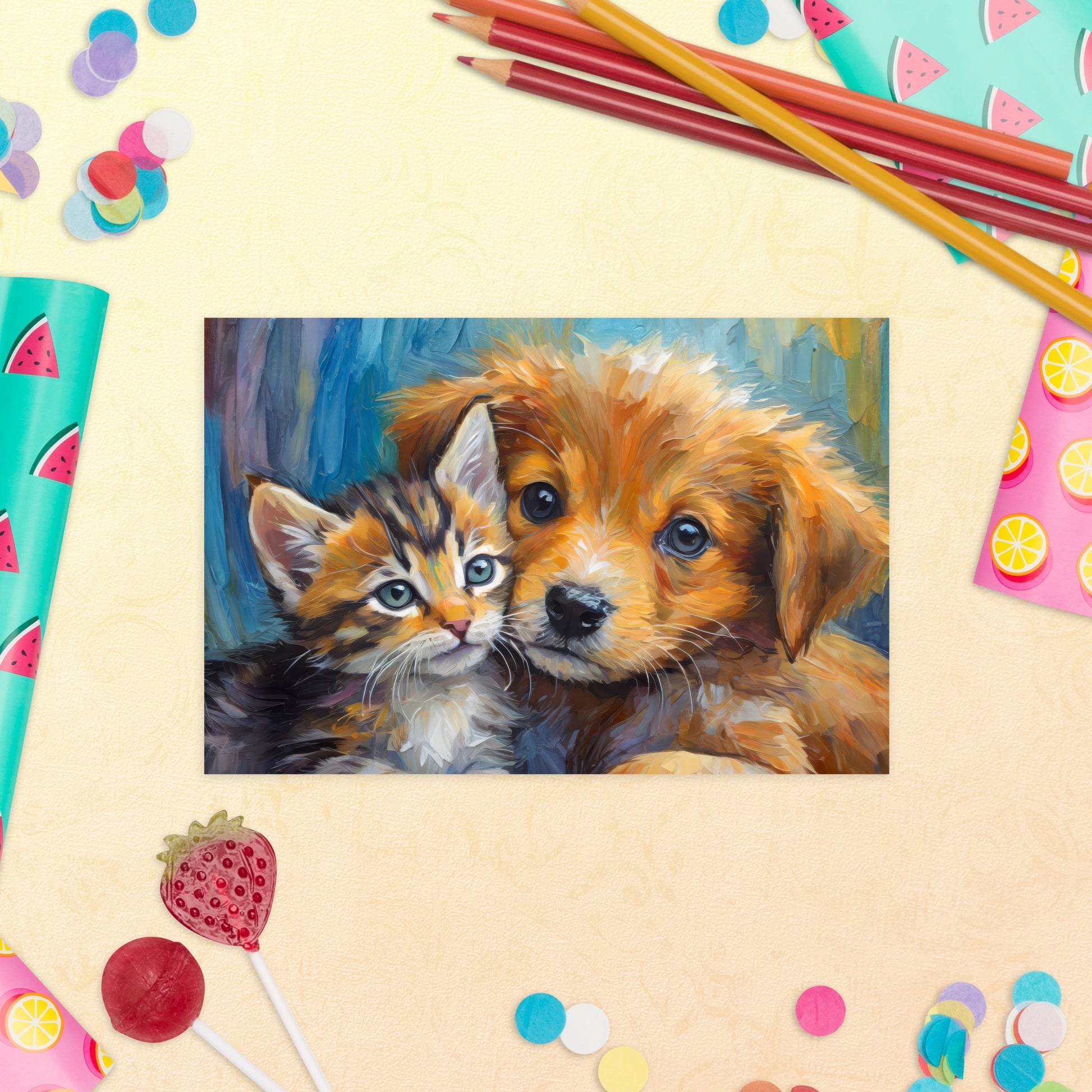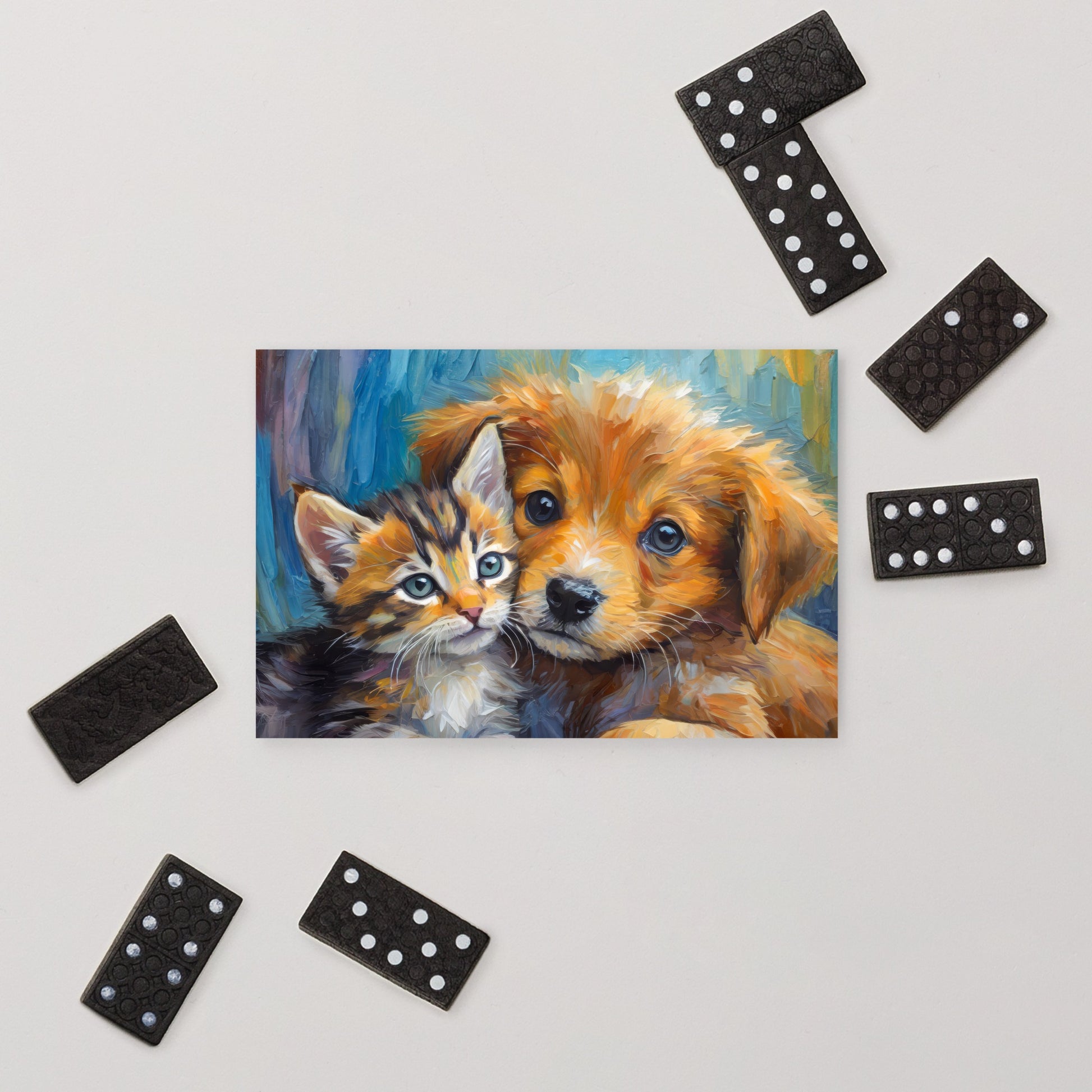 Delight your friends and family with our charming post card, featuring a vibrant, stylish, and colorful oil painting of an adorable kitten and a cute puppy cuddling close together. Perfect for kids, pet lovers, and art enthusiasts, this delightful post card is a heartfelt way to share your messages and bring a smile to anyone's face.