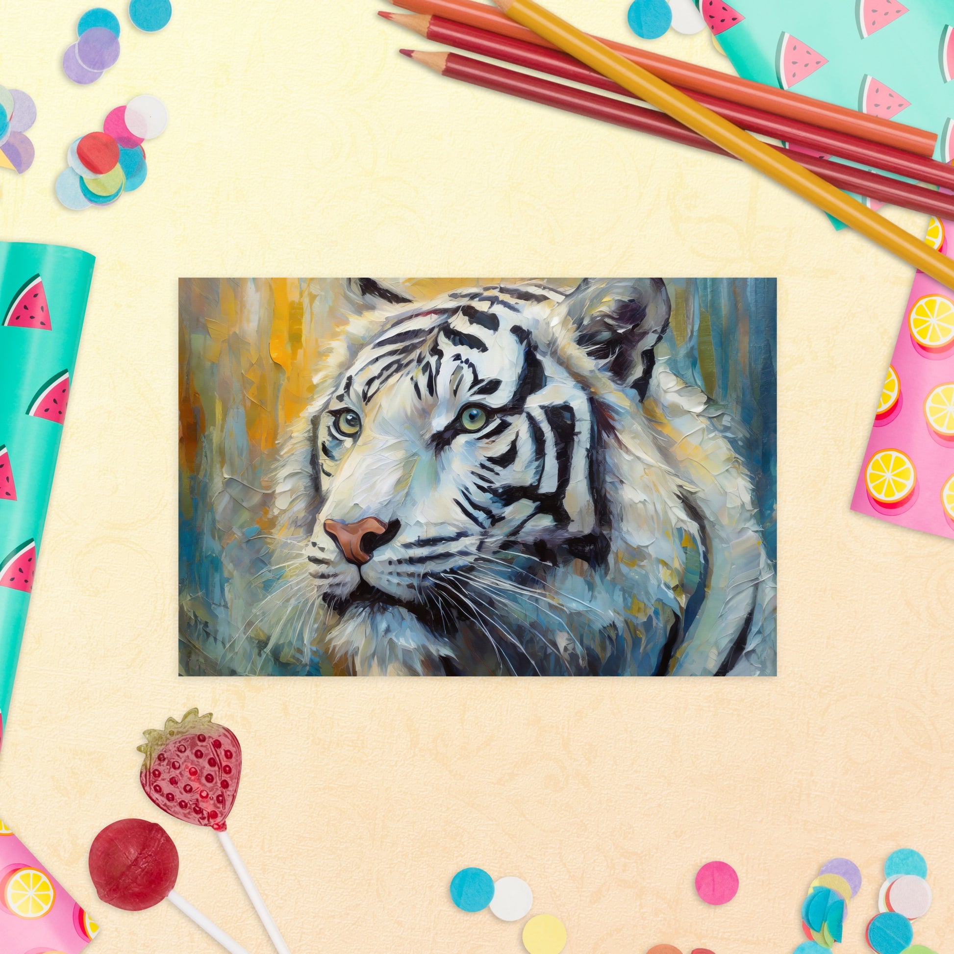 Bring the beauty of the wild into your correspondence with our standard postcard, featuring a vibrant and stylish oil painting portrait of a majestic White Tiger. This elegant and lifelike artwork is perfect for nature and wildlife lovers, adding a touch of sophistication to your stationery collection and desk décor.