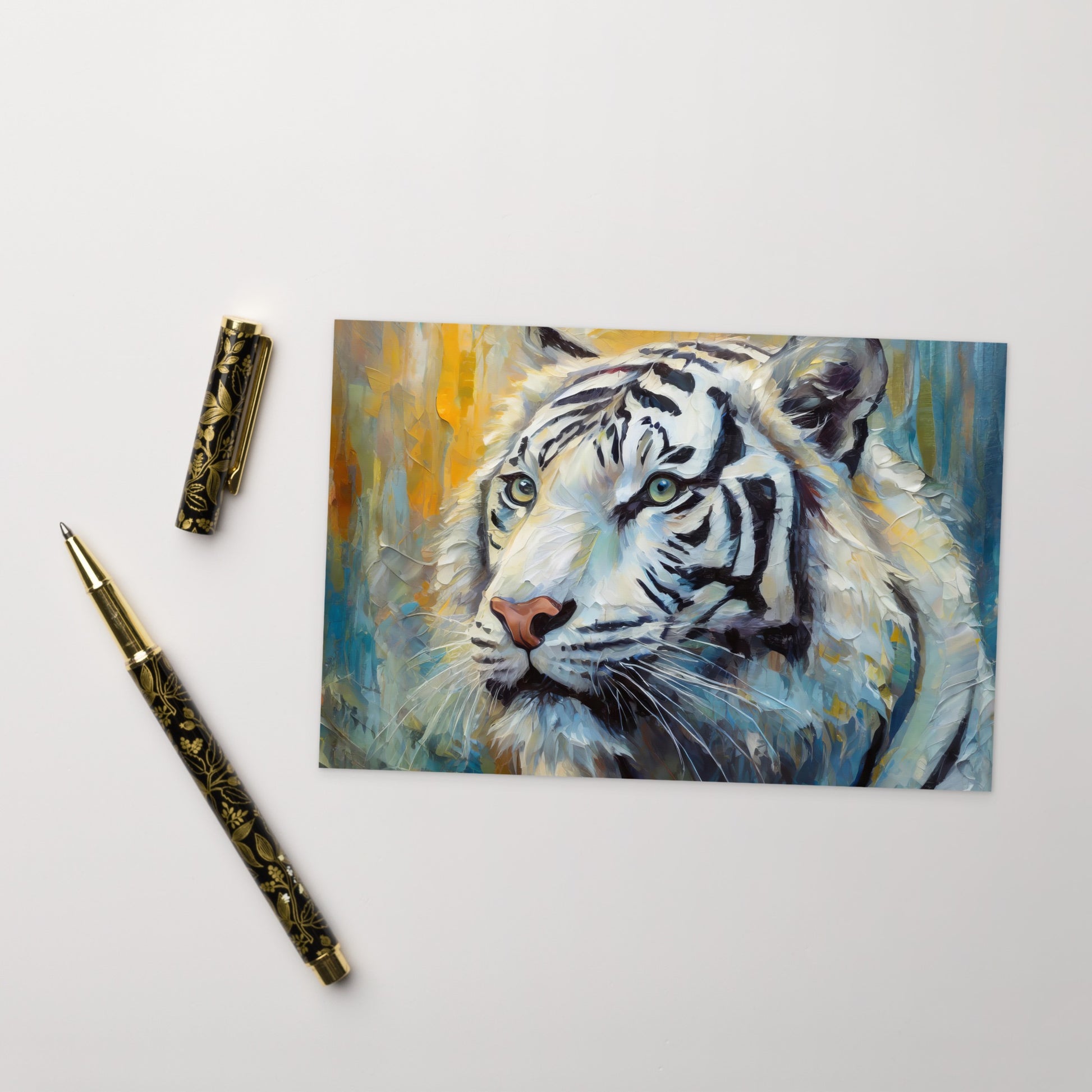 Majestic White Tiger Oil Painting Postcard – Stylish And Elegant Wildlife Art For Nature Lovers – Perfect Gift, Desk Décor For Home & Office