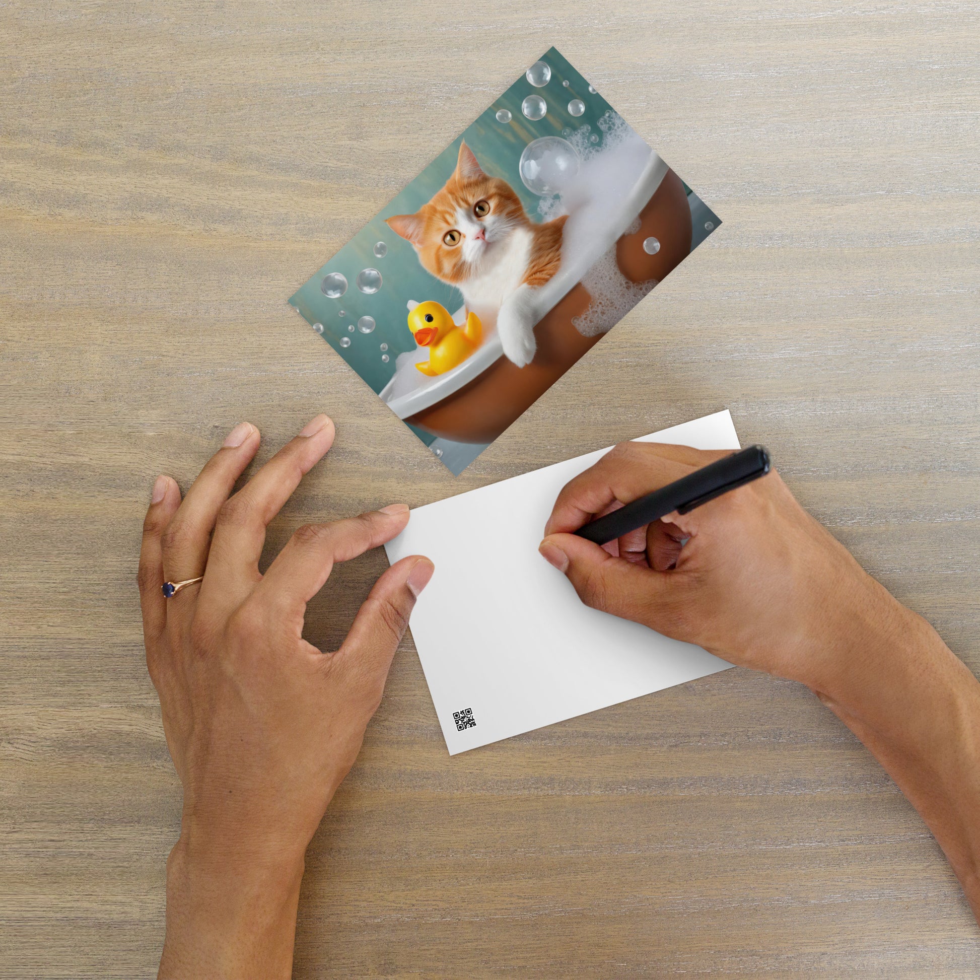Send a smile with this vibrant and colorful postcard featuring a delightful scene of a cat with orange fur enjoying a bubble bath in a small orange bowl. Beside the cat, a cheerful yellow rubber duck floats among the bubbles, while more bubbles drift through the air, creating a playful and heartwarming image.